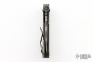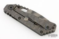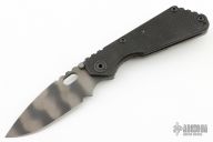 This Mick Strider SNG framelock folder features a tiger stripe blade with thumbhole and notched thumbrest. The handle has a black G-10 and flamed titanium frame with titanium clip, tip up carry. Jimping on blade spine. Lockup is a little late, around 60%. Has some scuffs and scratches great condition otherwise.