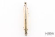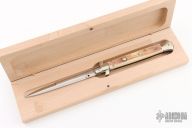 This 11" Picklock by Frank Beltrame features a polished bayonet ground blade with false top edge. The handle has nickel silver bolsters, front and rear, mammoth ivory scales,  brass liners and stainless steel spring. Comes with a wooden display box. Has a few light scratches, otherwise excellent condition.