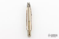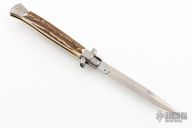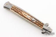 This 11" Picklock by Frank Beltrame features a polished bayonet ground 4mm blade with false top edge. The handle has stainless steel bolsters, front and rear, stag scales, brass liners, stainless spring. Excellent condition.