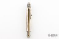 This 11" Swivel bolster by Frank Beltrame features a polished dagger ground 4mm blade with false top edge. The handle has stainless steel bolsters, front and rear, stag scales, brass liners, stainless spring. Excellent condition.
