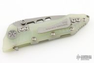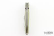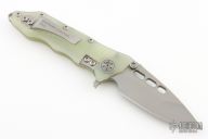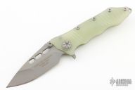 This flipper features a bead blasted drop point blade with dual thumbstuds, flipper, and notched thumbrest. The handle has a jade G-10 frame, bead blast stainless steel backspacer and tip up clip. Nice detent, lockup and blade seating. Includes the original box and papers. Excellent Condition.