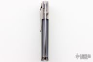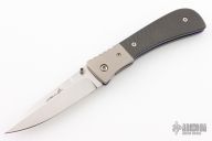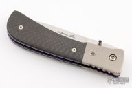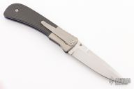 This "Tighe-Pan" liner lock folder by Brian Tighe features a hand rub satin finished blade with a single thumbstud. Bead blasted titanium bolsters, carbon fiber scales, anodized titanium liners and a tip down titanium clip. Nice detent, lockup and smooth action. Has a few light scuffs, otherwise excellent condition. Comes with a zippered case.