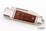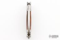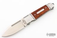 This Impi slipjoint by Andre De Villiers features a satin finished spear point blade with fullers. The handle has a stainless steel frame with snakewood inlays, stainless steel spring and lanyard hole at the butt. Nice smooth function, lockup and blade seating. Comes with velcro pouch. Excellent condition.
