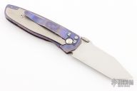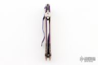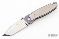 This ADV Tanto Linerlock has a chisel ground blade with satin finished flats and polished grinds, notched thumbrest and a thumb disc. The handle has bead blasted titanium overlays, anodized and jeweled titanium liners and tip down clip. Nice lockup, detent and blade seating. Comes with a zippered case. Has some light scratches, otherwise excellent condition.