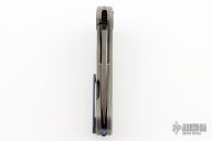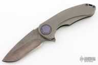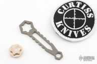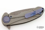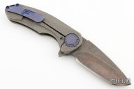 This F3 Medium by Curtiss Knives features a dark tumble finished blade with notched thumbrest and flipper. The handle has a milled and stonewashed titanium frame over anodized titanium backspacer and tip up clip. Smooth and fast opening using a Caged Bearing System. Nice blade seating, detent and lock up.  Includes zippered case. Excellent condition.