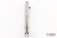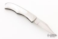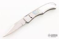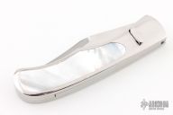 This interframe automatic by Judy Gottage features a hand rub satin finished blade, it is marked "Judy Gottage Maker" on the blade. The handle has a mirror polished stainless steel frame and push button, mother of pearl inlays, and a stainless steel spring. The handle has no exposed hardware. Has some light scratches, otherwise excellent condition. Judy's knives don't come up for sale very often. Includes a padded zippered case.