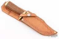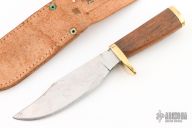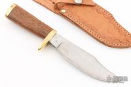 This knife by Bill Cassaberry features a satin finished blade with false top edge, .266" blade stock and 1.433" blade depth, hidden tang construction. The handle has a brass guard and butt with a wood grip. Comes with a hand tooled brown leather sheath. Has some scratches and oxidation, otherwise good condition.