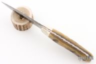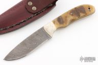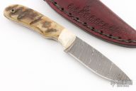 This Knife by Thomas Rucker features a Damascus blade with .152" blade stock and 1.179" blade depth, full tang construction. The handle has bone bolsters and rams horn scales with mosaic pins, fileworked tang. Comes with a brown leather sheath. Has some oxidation on the tang, otherwise good condition.