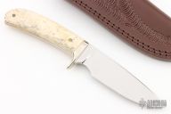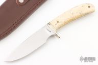 This hunter by Harry Mitchell features a mirror polished blade with .188" blade stock and 1.124" blade depth, full tapered tang construction. The handle has a nickel silver guard with bone scales. Comes with a brown leather sheath. Excellent condition.