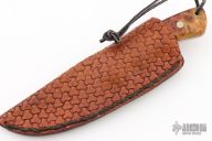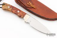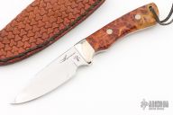 This Knife by Thomas Rucker features a mirror polished blade with .176" blade stock and 1.342" blade depth, full tapered tang construction. The handle has nickel silver bolsters and burl wood scales with nickel silver pins. Comes with a hand tooled brown leather sheath. Excellent condition.