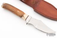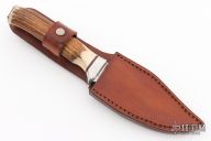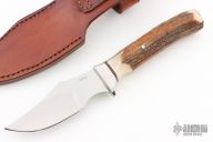 This knife by Gary Corum features a mirror finished blade with fileworked thumbrest, .139" blade stock and 1.444" blade depth, hidden tang construction. The handle has a stainless steel guard, stag grip and stainless steel butt, red/black spacers. Comes with a brown leather sheath. Has a few light scratches and a couple small oxidation spots, otherwise excellent condition.