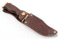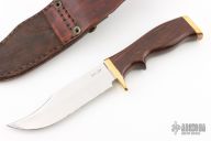 This knife by Kirby Bailey features a mirror polished blade with false top edge, .133" blade stock and 1.253" blade depth, hidden tang construction. The handle has a brass guard and butt with a cocobolo grip. Comes with a brown leather sheath. Has a forging mark on the b-side of the blade, otherwise excellent condition.