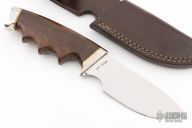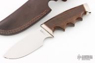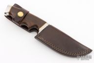 This Model 400 by Gerber Legendary Blades features a polished blade with notched thumbrest, .145" blade stock and 1.481" blade depth, hidden tang construction. The handle has a stainless steel guard and butt with wood grip and brass spacers, has finger grooves. Comes with a brown leather sheath. as a few very light scratches, otherwise excellent condition.