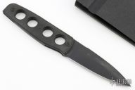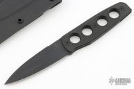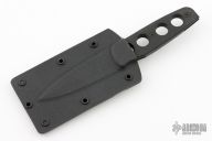 This is a Bud Nealy designed knife with full tang construction and a blade thickness of 1/8" and depth of 1". Notches on thumbrest and index finger hold. Handle is drilled for reducted weight and has black G-10 scales. Versatile Kydex carry system allows for belt, boot and neck carry. #220 on blade. Has some light scuffs and scratches, great condition otherwise.