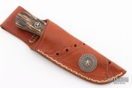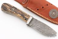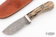This knife by Roy Hill features a Damascus blade with fileworked spine and tang, .113" blade stock and 1.352" blade depth, full tang construction. The handle has a stainless steel guard with pale moon ebony wood scales and white spacers. Comes with a brown leather sheath. The tang and the scales aren't even, otherwise excellent condition.
