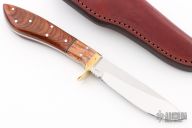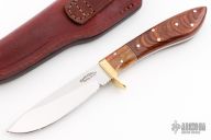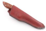 This knife by David Childers features a mirror polished blade with fileworked spine and under the ricasso, .142" blade stock and 1.020" blade depth, full tang construction. The handle has a brass guard, giraffe bone and diagonal cut dymondwood scales. Comes with a brown leather sheath. Stamped "R 08" on the b-side of the ricasso. Excellent condition.