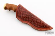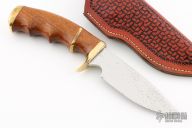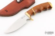This knife by Steve Davenport features a mirror finished blade with .180" blade stock and 1.236" blade depth, hidden tang construction. The handle has a brass guard, sub-hilt and butt with wood grip and a brass spacer. Comes with a hand tooled brown leather sheath. Has some scratches and pitting on the blade, otherwise good user condition.