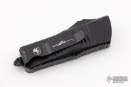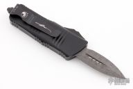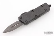 This Troodon Mini OTF automatic by Microtech knives features a Damascus double-edged blade, and a carbon fiber and aluminum handle with black ringed hardware, tip down stainless steel carry. Glass breaker. S/N 189. Dated 08/2022. Has a few light scratches otherwise the knife is in excellent condition.