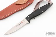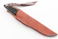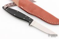 This knife by Hattori features a satin finished blade with a full tang construction. .109" Blade Stock. .615" Blade Depth. The handle has black paper micarta scales. Includes a brown leather sheath. Excellent Condition.