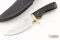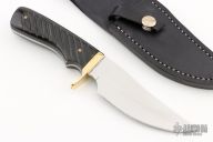 This knife by Kepler Knives features a mirror polished blade with .151" blade stock and 1.444" blade depth, full tang construction. The handle has a brass guard with fluted buffalo horn scales and brass pins. Comes with a black leather sheath. Has a few light scratches, otherwise excellent condition.