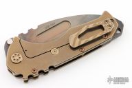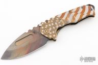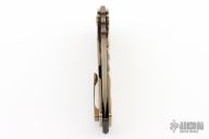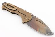 This Praetorian T from Medford Knife and Tool features a vulcan finished blade with notched thumbrest and fullers. The frame has a stonewashed and anodized titanium frame with matching tip up pocket clip, black steel backspacer doubles as a glass breaker. Comes with original hard case and box. Excellent condition.