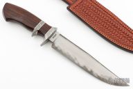 This Sub-Hilt Fighter by Master Smith Burt Foster features a Stainless Clad San Mai Damascus blade with a carbon steel core, nearly sharpened top edge, .228" blade thickness and 1.381" blade depth, hidden tang construction. The handle has a Damascus guard and sub-hilt, mirror polished stainless steel spacers, desert ironwood grip, fluted butt. Comes with a hand tooled brown leather sheath and a zippered case. Excellent condition. Made in 2009.