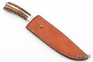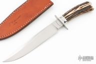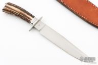This Fighter by Master Smith Russ Andrews II features a hand rubbed satin finish blade with false top edge and visible temper line, .240" blade stock, 1.303" blade depth, hidden tang construction. The handle has a stainless steel guard and butt, stag grip. Includes a brown leather sheath and a zippered case. Excellent condition. This one wears his Journeyman Smith stamp, he became a Master Smith in 2008.