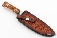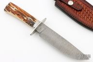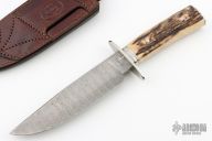 This Bowie by Journeyman Smith Mike Ruth features a Damascus blade with visible temper line and false top edge, .278" blade stock and 1.448" blade depth, hidden/mortise tang construction. The handle has a hammered stainless steel guard, fluted stainless steel collar, two-piece stag grip with stainless pins and butt cap. Comes with a hand tooled brown leather sheath by Kenny Rowe's Leather. Excellent condition.