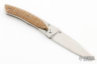 This liner locking folder by William Henry features a satin finished blade with dual thumb-studs. The handle has curly Miranjiba scales and stainless steel liners. Nice detent, lockup and blade seating. Excellent condition. Comes with original box, COA and black leather sheath.
