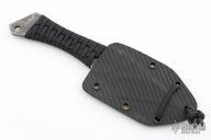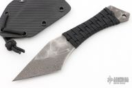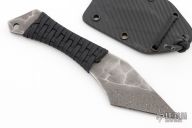 This Chimera by Heretic Knives features a Vegas Forge Damascus flintknapping textured blade with .169" blade stock and 1.775" blade depth, full tang construction with flat paracord wrapped handle with lanyard hole at the butt. Comes with a kydex sheath. Has some scuffs, otherwise excellent condition.