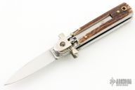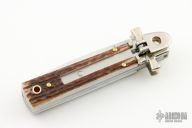 Angelo Campolin Sr. was born in 1923 in Maniago, Italy. He worked on perfecting his knife making skills before WWII and at this time made his first switchblades. After the war, in 1947 he started his company and made 30 stilettos with the marking “Angelo Campolin”. In the 1970’s Angelo’s son Gianni started to work in the company and they were specializing in folding hunting knives and also manual folding stilettos for the Robert Klaas company in Solingen Germany with their Kissing Cranes mark. In 2002 American switchblade collectors Dan Fuller, Brad West, and Tim Zinser were visiting Maniago and enjoying a few glasses of wine in a bar with Angelo Jr. and Gianni. The discussion was about a new name for some knife projects they wanted to pursue. It was Brad West that suggested the tang stamp should be AGA, for Angelo, Gianni, Angelo, thus representing three generations in the knife making business. The Campolins liked it and it stuck. In the beginning it was just a few items, but grew to the point where now there are 12 models and different scale options. The goal has been to offer quality switchblades using the old methods and traditions. Being a collector himself, Angelo Jr. knows what others like. The company headquarters has moved to Austria with production still in the original Maniago shop, as well as the others in Maniago that produce the knives for A.G.A. Campolin.