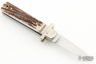 This knife features a satin finished drop point blade. The handle has nickel silver bolsters, stag scales and stainless steel liners. Comes with original box. Excellent Condition.