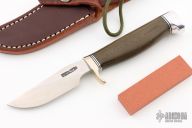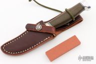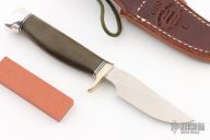 This GTR Special by Randall Made Knives features a satin finished blade with notched thumbrest, .164" blade stock and .932" blade depth, hidden tang construction. The handle has a nickel silver guard, green linen micarta grip, black/duralumin spacers, duralumin crow's beak butt. Knife comes with a left handed brown leather sheath with belt loop. Excellent condition.