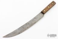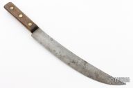 This Foster Bros Knife is made of carbon steel and has .070" blade stock and 1.487" blade depth, full tang construction. The handle has dark wood scales with textured chamfers and brass pins. Has some oxidation and patina throughout, has some scratches and dings on the handle, etc, good condition for its age.