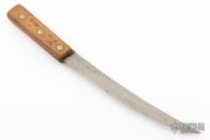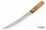 This Foster Bros Knife is made of carbon steel and has .088" blade stock and 1.013" blade depth, full tang construction. The handle has wood scales and brass pins. Has some oxidation and patina throughout, has some scratches and dings on the handle, etc, good condition for its age. Stamped "Property of Nella Bros" on the handle.