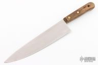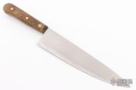 This Foster Bros Knife is made of stainless steel and has .104" blade stock and 2.090" blade depth, full tang construction. The handle has wood scales and brass pins. Has some oxidation and patina throughout, has some scratches and dings on the handle, etc, good condition for its age.