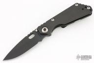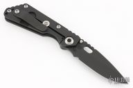 This JVA by Mick Strider is larger than a PT, but smaller than an SNG. It features a black DLC blade with notched thumbrest and thumbhole. The handle has a black DLC titanium frame with matching tip up clip. New condition.