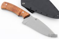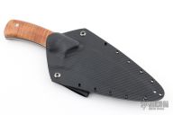 This Hunter by Black Raven Arms features a bead blasted blade with false top edge, .101" blade stock and 1.980" blade depth, full tang construction. The handle has curly koa wood scales with mosaic pins, nickel silver and black G-10 liners. Comes with a kydex sheath with belt loops. Excellent condition.