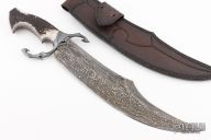 This knife by The Sobral Brothers is incredible, it features a Damascus clip point recurve blade with a false top edge, deep fullers, .261" blade stock and 2.732" blade depth, hidden/frame tang, with tapered construction. The handle has a lavish blued steel guard with engraved gold inlays, beautiful stag grip and stainless pins. Fits amazing in the hand. Comes with a skillfully hand-tooled leather sheath, and a very classy leather zippered case. Excellent condition. They just keep getting better and better don't they!
