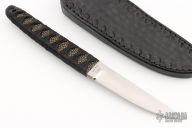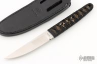This Tanto by Mickey Yurco features a satin finished blade with .164" blade thickness and .842" blade depth. The handle has black cord wrap over brown rayskin with frog menuki. Comes with handtooled leather belt sheath. Excellent condition.