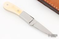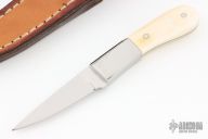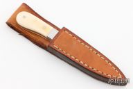 This knife by Judy Gottage features a mirror polished blade with .105" blade stock and .495" blade depth, full tang construction. The handle has dovetailes stainless steel bolsters with mammoth ivory scales. Comes with a brown leather sheath. Has a couple light scratches, otherwise excellent condition.
