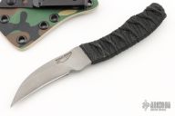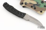 This Nighthawk by Jason Stout features a stonewash finished, chisel ground hawkbill style blade with swedge and fuller, 0.152" blade stock and .822" blade depth. The handle is comprised of Japanese style wrap over hidden tang construction. Excellent condition.