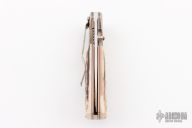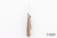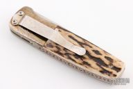 This Model 6 linerlock by Mike Irie features a hand rub satin finished blade with a single tiger eye inlaid thumbstud. The handle has bronzed and acid etched dovetailed bolsters, stag scales with red liners, titanium liners that have been lightly anodized, fileworked and bronzed stainless steel backspacer, acid etched tip down stainless steel clip. Nice detent, lockup and blade seating. Excellent condition.