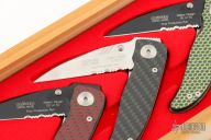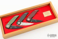 This Walker Design Premium Collector Set is from the First Production Run and is #00 of 50 by Klotzli Knives. It features all three configurations with wharncliffe partially serrated blades with single thumbstuds and notched thumbrests. The handles hav carbon fiber scales, titanium liners, and tip up stainless steel clip.  Excellent condition. Comes with a wooden display box. All are #00 of 50