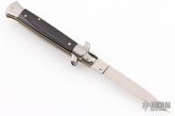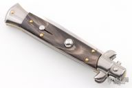 This Swivel Bolster Auto has a polished stainless steel spear point 4mm thick blade. The handle is composed of a steel front and rear bolsters, brass liners all complemented by buffalo horn scales. Excellent Condition.
