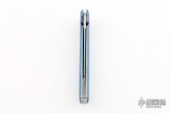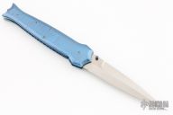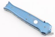 This custom D/A linerlock by Matt Diskin features a dagger-style hand rub satin finished blade with a false top edge and dual thumbstuds. The handle has brush finished and anodized titanium scales, mother-of-pearl push button, anodized titanium liners with jeweled interiors, fileworked and anodized titanium backspacer. Strong leaf-spring action and smooth manual action. Comes with a Bill's case. Excellent Condition.