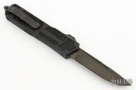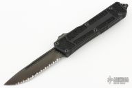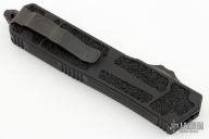 The Microtech Scarab II is a high quality tactical out-the-front knife, based on the original Microtech Ultratech design. Built to withstand the extreme, the Scarab II excels in high-intensity covert operations. The Scarab II is designed for a broad spectrum of utility and close quarter combat applications for use by qualified law enforcement, military, and government agency operatives. The Scarab II is fabricated to the highest possible standards to assure reliability and safety with its use. Featuring a one-handed, open and close, dual-action out-the-front (OTF) design, and fully serrated edge blade. The Scarab is produced with a large easy-to-grip handle that contains non-slip grip inlays on both sides. Comes with original box and papers. Has some light scuffs and scratches, otherwise great condition.