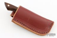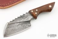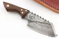 This knife by Chris Peterson features a Damascus blade, fileworked spine, .165" blade stock and 1.329" blade depth, full tapered tang construction. The wood scales. Comes with a brown leather sheath. Excellent condition.