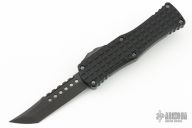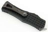 This Hera by Microtech Knives features a Hellhound DLC stonewashed blade with fullers. The handle has a black aluminum frame with Frag pattern, tip down DLC titanium clip with ceramic ball inset. Dated 01/2023 and s/n 006. Comes with original box and papers. Has a couple light marks, otherwise excellent condition.