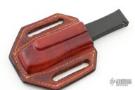 This Halo III features a hand rub satin finished blade hand-ground by Walter Brend. Dated 9/99. #023. Marked "Blade Grind by W. Brend" on charging handle. Includes original box, sheath, and paperwork. Comes with a custom brown leather belt sheath. Has some light scuffs on the frame, otherwise excellent condition.